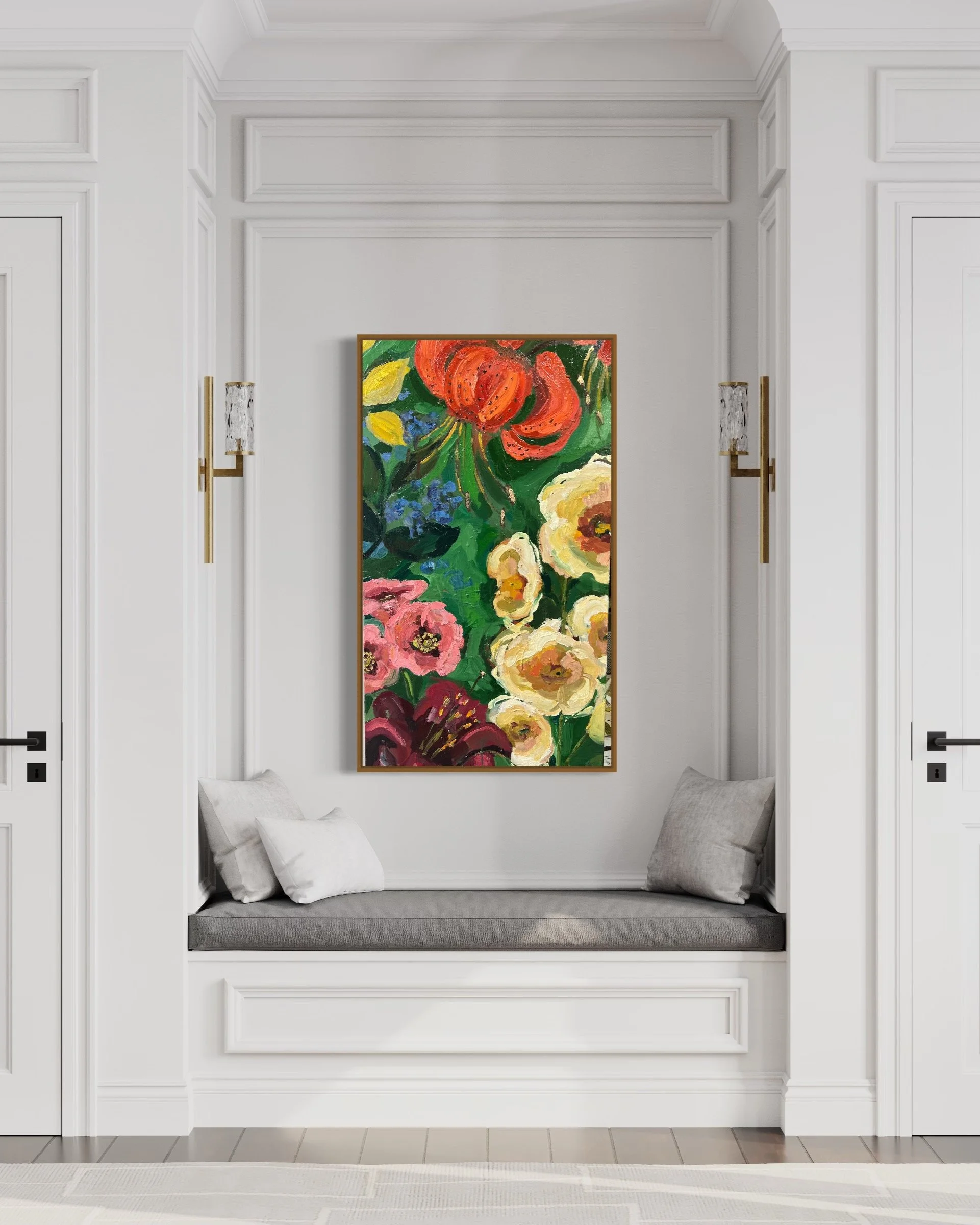 This cheetah portrait has so much energy and also a bit of intrigue. It is an oil on paper framed and matted behind glass. The peachy, floral wallpaper is a perfect foil for such a fierce animal.