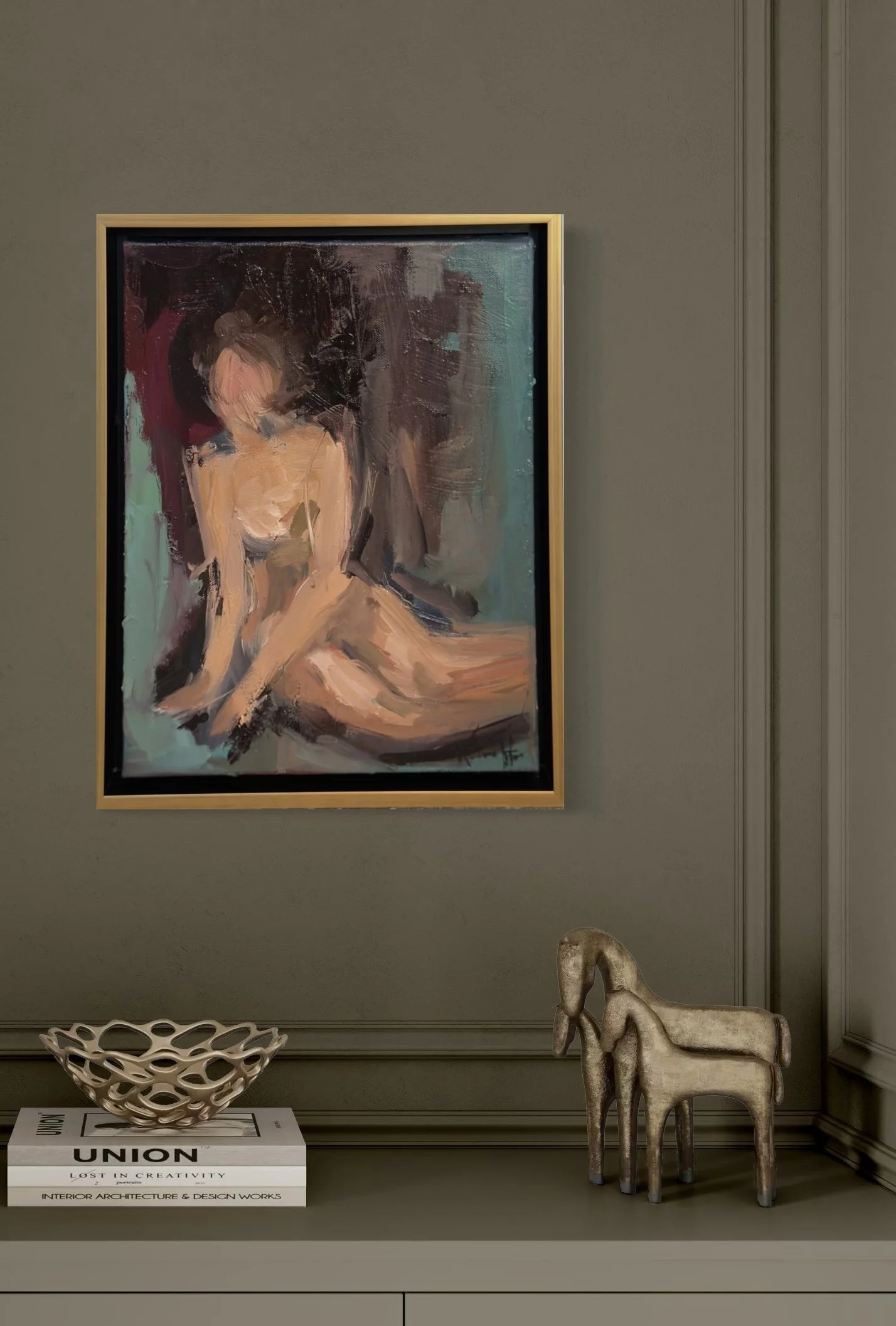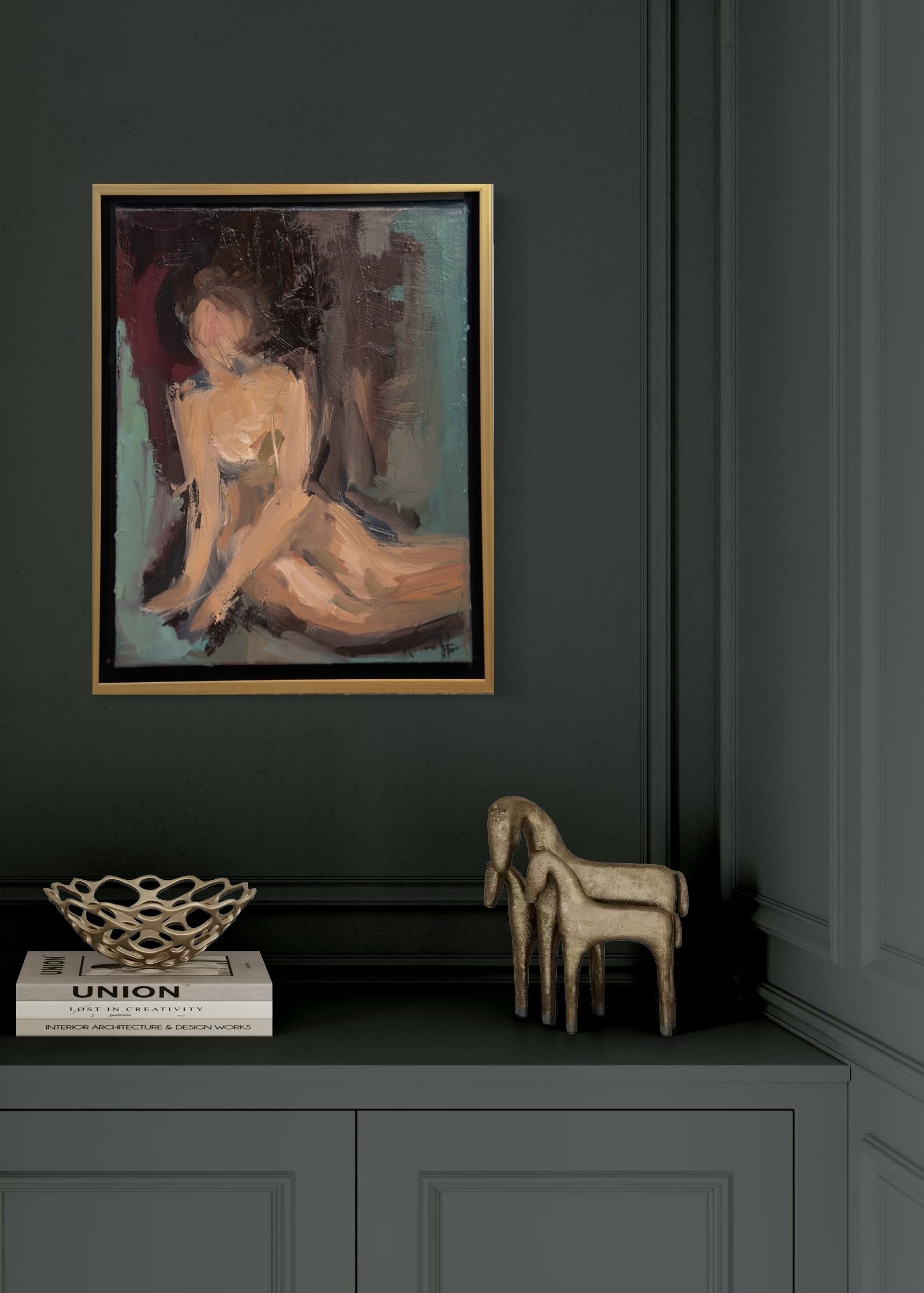 Lilly is surrounded by a rich, impasto texture. The variety of greens are broken up by gorgeous botanicals and hints of flowers.