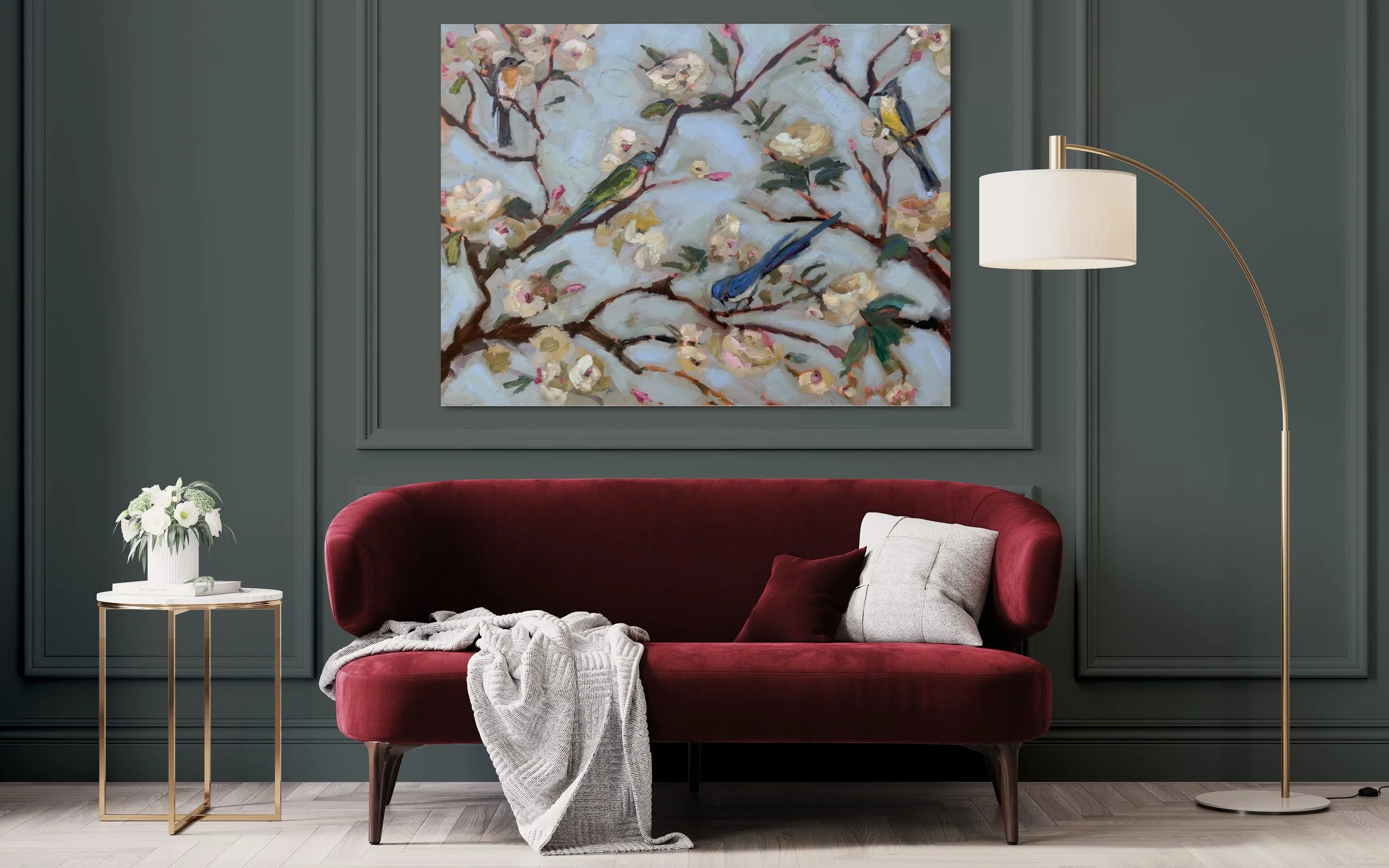 Spring’s Flutter 1 boasts a variety of blues as well as metallic elements. The energy is flowing through with the butterflies and vibrating colors. This print comes in a variety of sizes. Options are: prints on rolled canvas with a 2” border on each side or gallery wrapped canvas that is ready to hang. All giclee prints on canvas are hand embellished for enhanced texture. These pieces are not framed.
